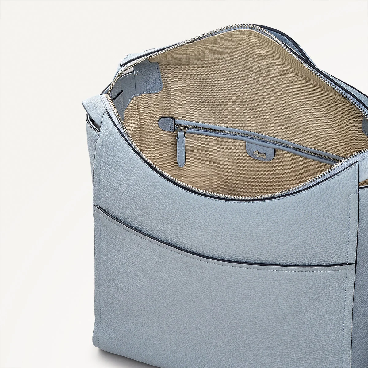 - Curved zipper closure with branded metal puller and leather trim