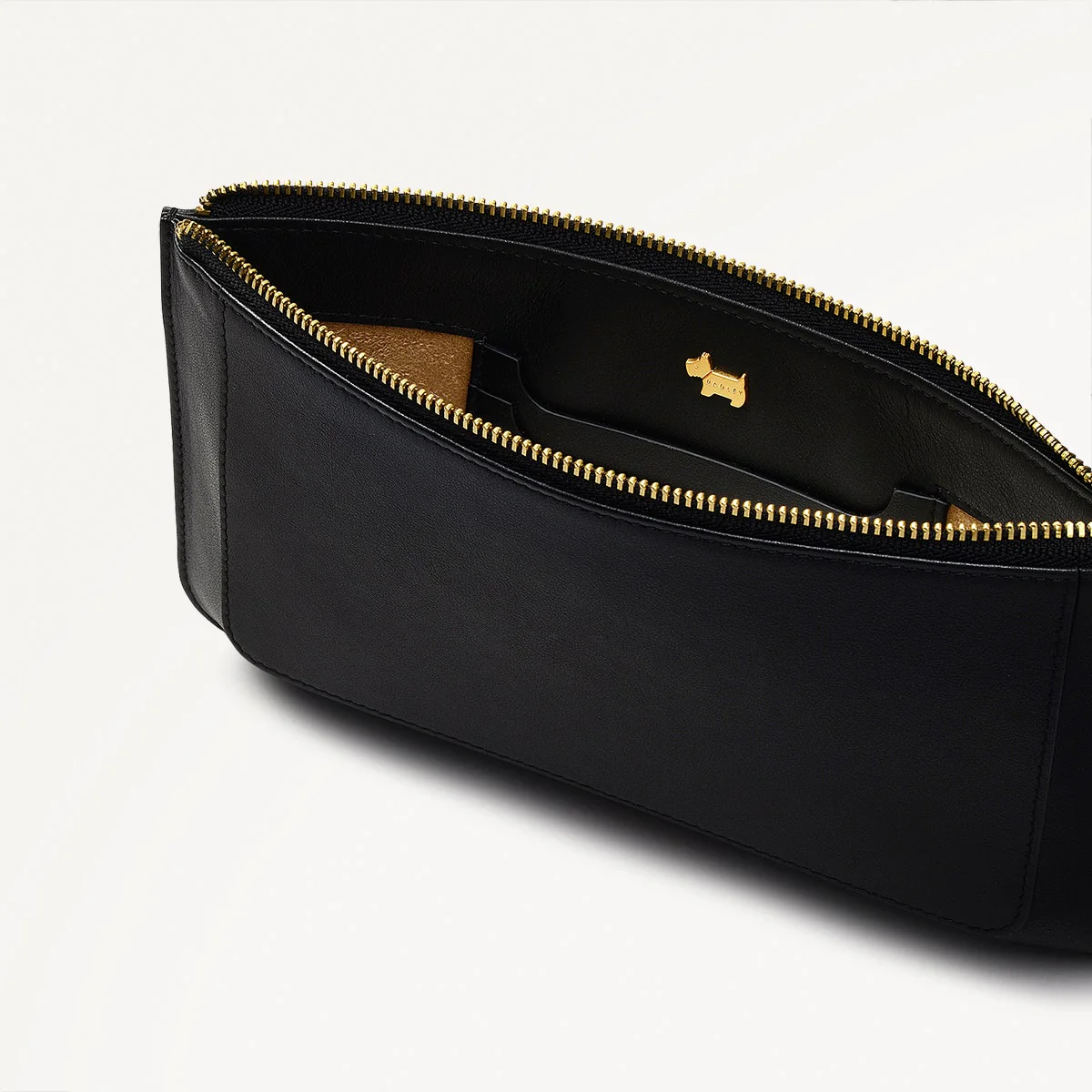 - Leather zip pull with ball hardware